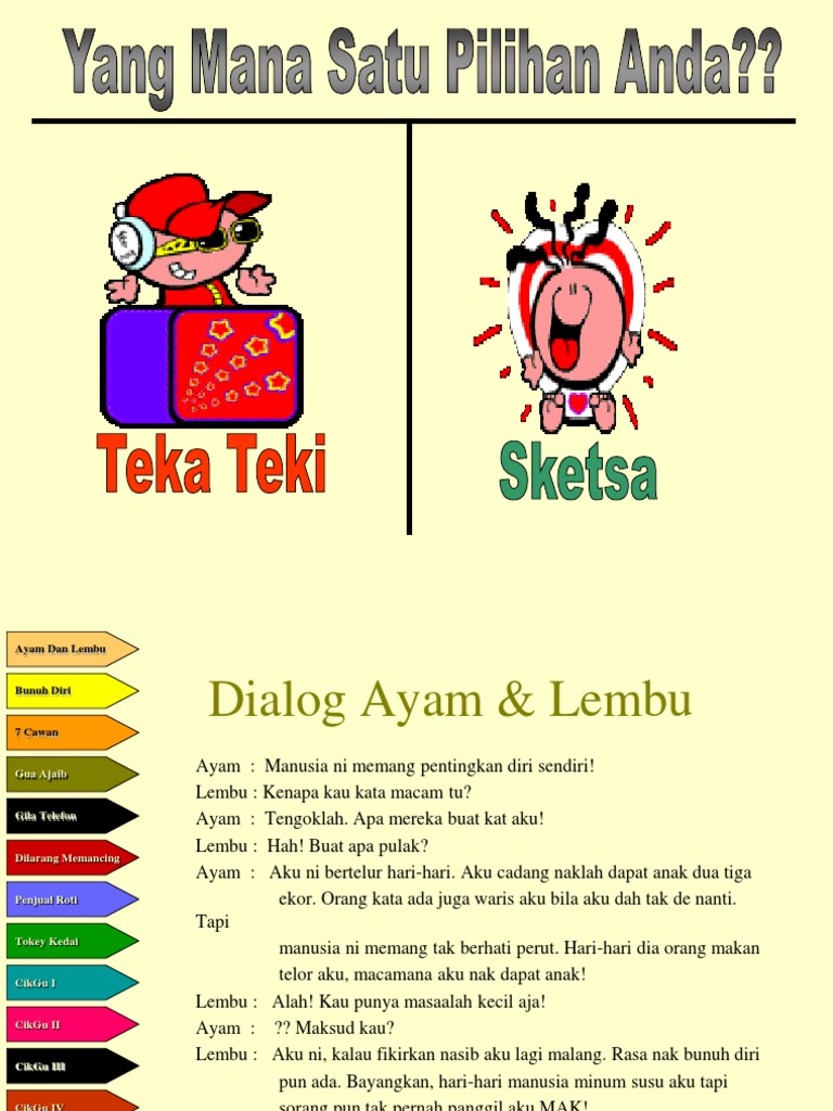 Semua tetangganya yang berada di sekitarnya mengetahui bahwa Nyonya Ramli sangat rajin dan cekatan terutama dalam bidang jahit-menjahit dan sulam-menyulam namanya terkenal sampai ke mana-mana. Kisah Lawak Suami IsteriKantoi Suami Curang Sepasang suami isteri yang telah mempunyai 3 orang anak sedang berbual sambil menonton TV di dalam bilik mereka.